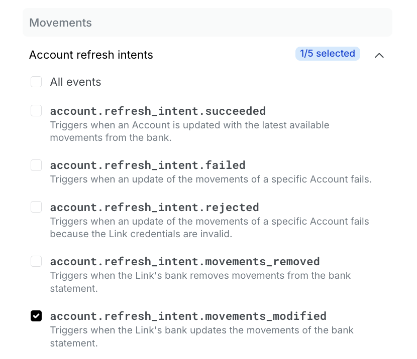 En tu dashboard debes ir a Webhooks → Endpoints → Create + → Movements → Account refresh intents y luego seleccionar el evento account.refresh_intent.movements_modified