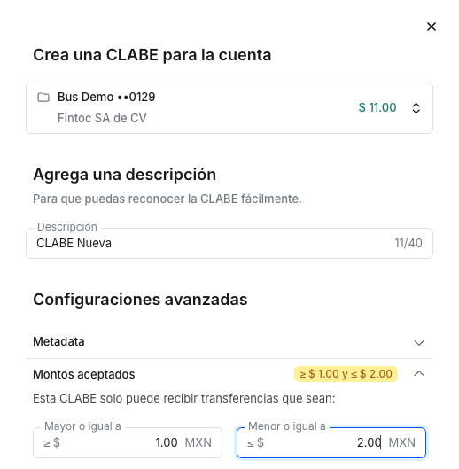 Ahora puedes definir límites mínimos y máximos al crear una CLABE, ya sea desde el Dashboard o vía API. Si una transferencia entrante no cumple con el rango establecido, el sistema la rechazará automáticamente.