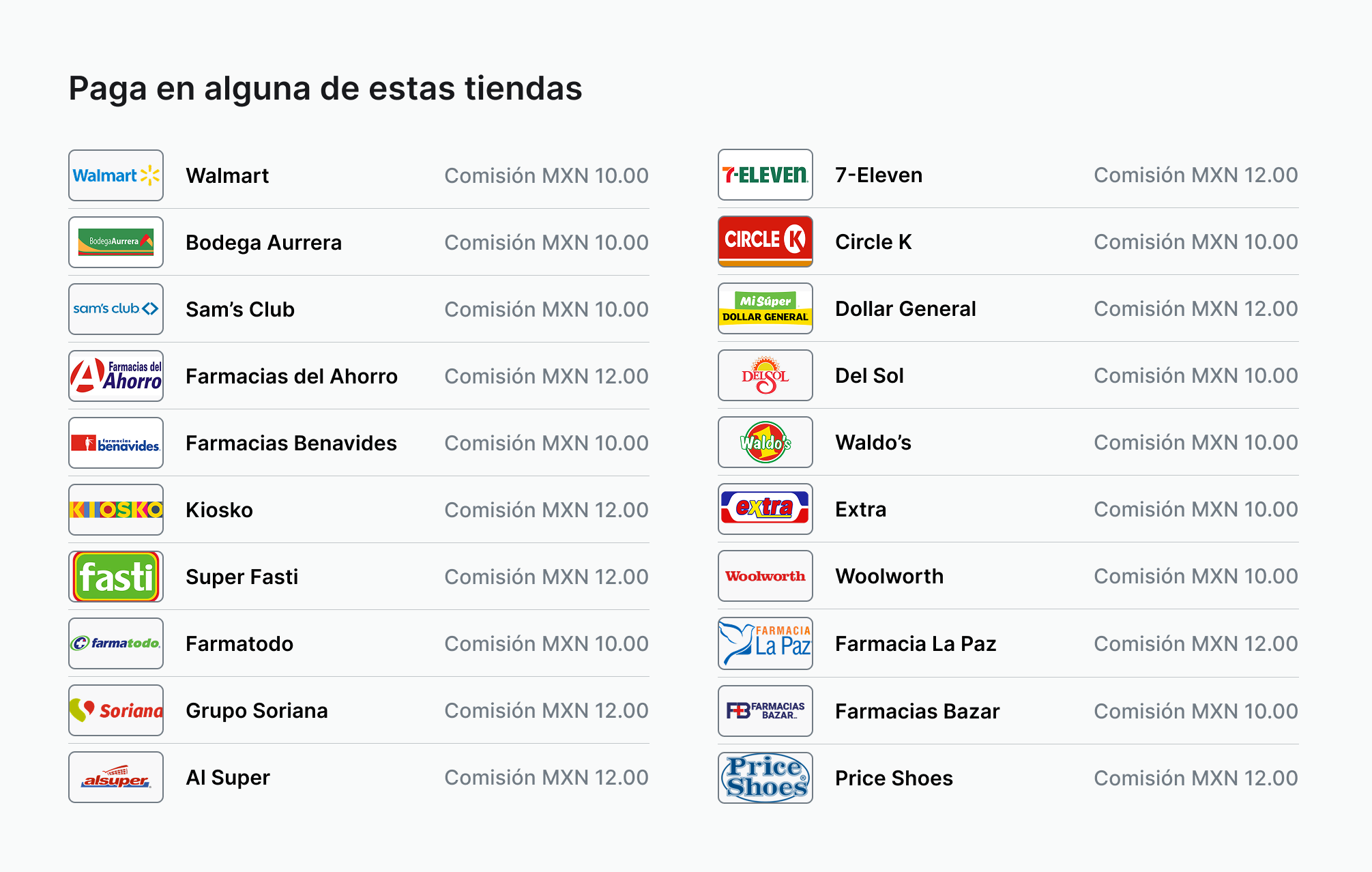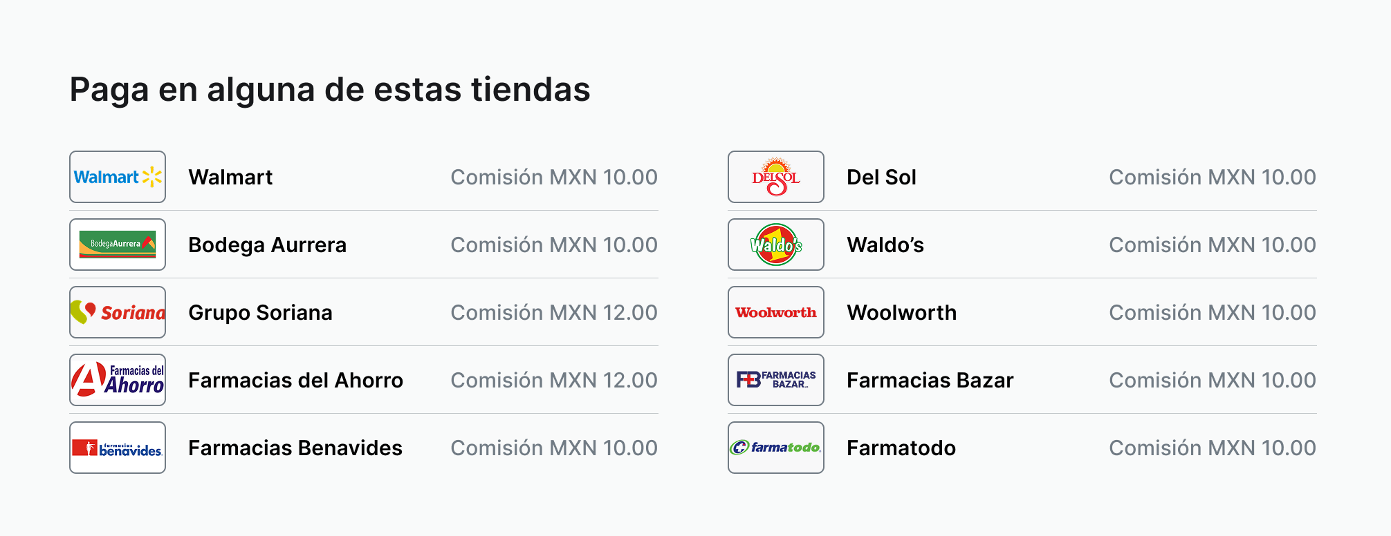 Maximum Amount Limit by LocationSome locations only accept payments up to 5,000.00 MXN, while others have no maximum limit. You should display specific logos and a list of all locations based on the payment amount, as shown in the example voucher above.