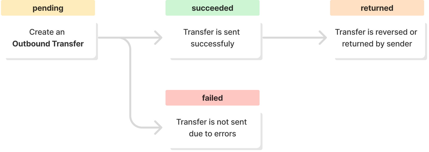 Transfers' status can be either pending, succeeded, failed, returned, return_pending or rejected. For more details on transfer statuses, check out the Transfers data model.