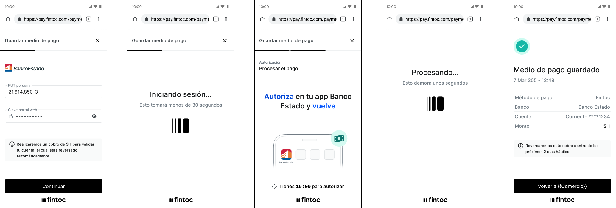 Use the redirect_url to redirect the customer to the Fintoc-hosted page. Where they will have payment flow and the option to save credentials for future payments.